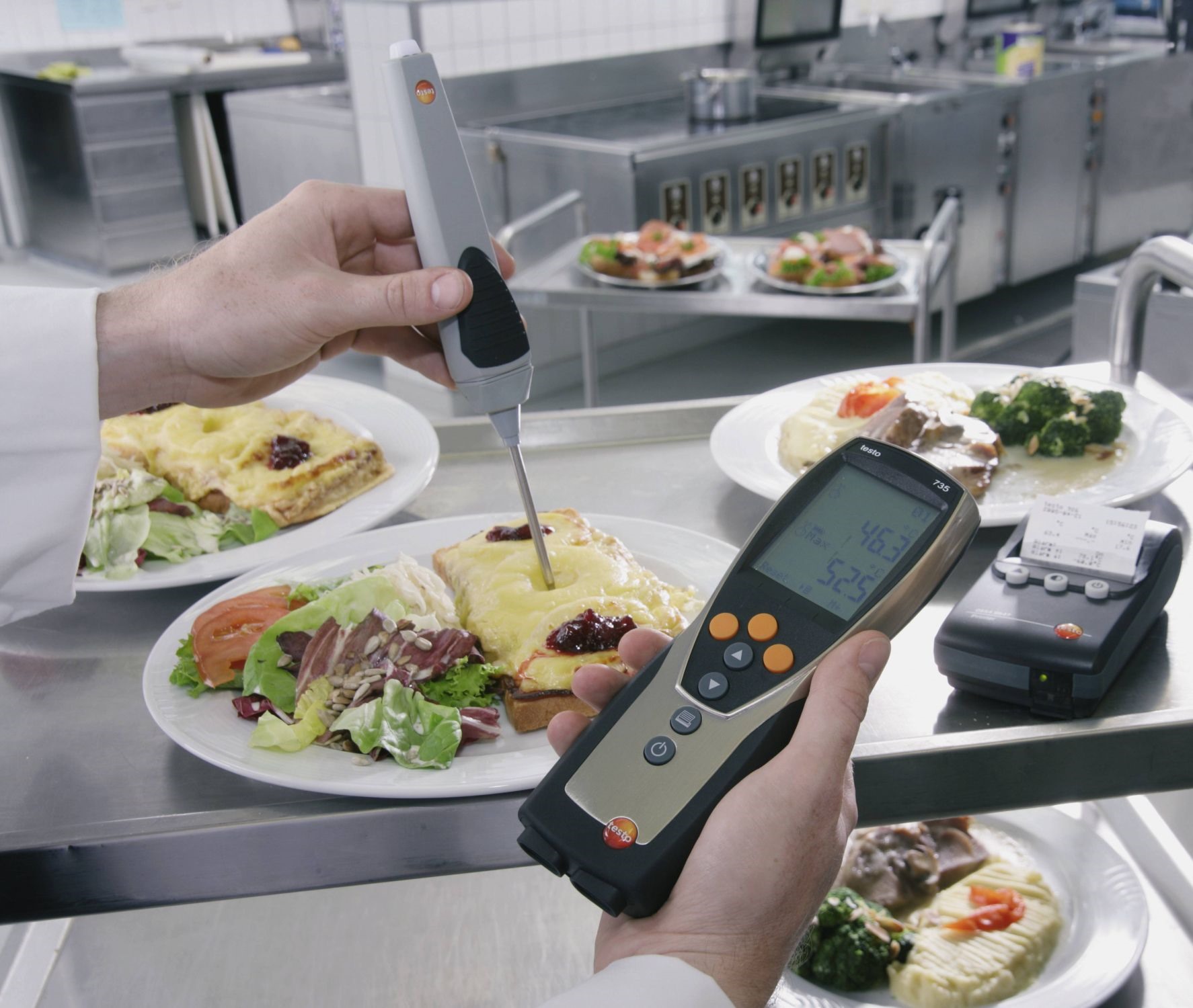 De schermverlichting laat het ook toe dat er gemeten kan worden in donkere omstandigheden. Daarnaast is de testo 735-1 temperatuurmeter waterproof conform beschermklasse IP 65, is getest conform EN 13485, is HACCP-conform en HACCP International gecertificeerd.
